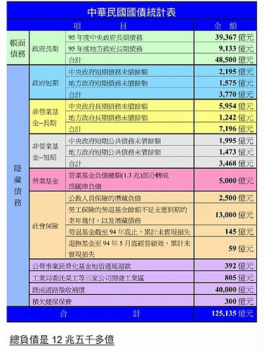 過去八年來,站在客觀的角度來看 我們的政府的確提供了帳面上美麗的榮景 包括高鐵(目前仍由政府背債中)、雪山隧道等等...... 不能否認這些看得見的實際硬體設備,看起來確實是漂亮的政績 但帳面下的公債,我們的政府卻為了我們及我們的下一代舉了多少債? 有多少人可曾仔細留意過