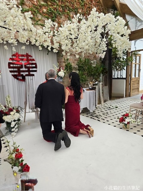 兩個都跪著奉茶呢! 老美丈夫很好,願意一起行禮如儀...但是老美真的比較糙老,他才39已經滿頭灰髮! 他很高大又帥氣(200公分高!新娘也很高),看到這背影才發現他顯老