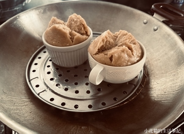 一樣是先放水(這次放四米杯)入大同電鍋裡讓它大火蒸出熱氣(大概已經蒸掉一米杯的水時)才開始放黑糖麵泥