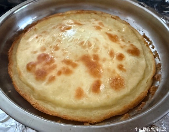 麵粉玩得興起,繼續上網找過年時興的甜點;找到黃油年糕....嗯嗯嗯,簡單,好,做! 材料: 1) 一顆蛋 (大) + 白糖或二砂 35克 先攪拌 2) 融化黃油(奶油=butter) 25克 + 全脂牛奶 (whole milk) 200 毫升 3) 糯米粉 130克 4) 把 1)+2) 全部倒入 3) 完全拌勻,過篩,耐熱容器內抹油把4)倒至9分滿入氣炸鍋設 170C(攝氏) = 340F(華氏)20分鐘,然後翻面再設定: 170C= 340F(華氏) 10分鐘