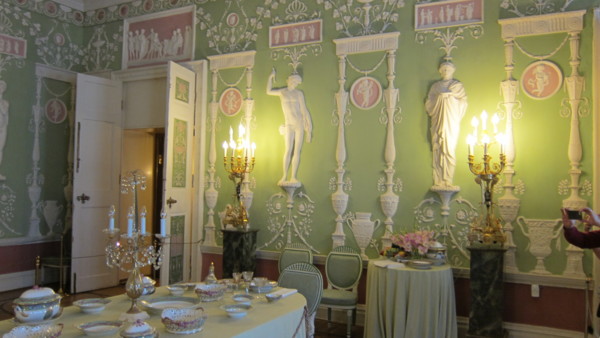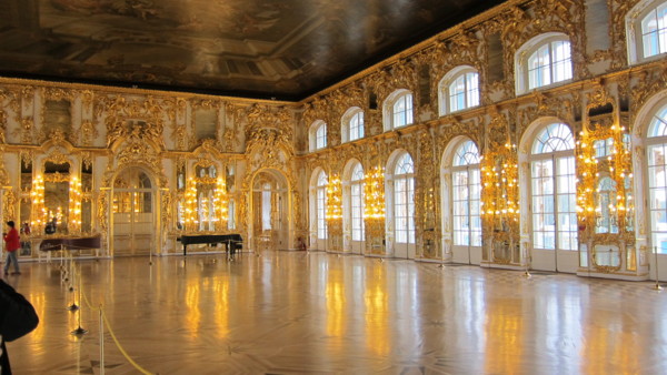 Day-02 2014/08/27 凱薩琳夏宮-彼得保羅要塞-涅瓦河遊船-尼古拉宮民俗舞蹈 天氣多變,早晚溫差大,室內外溫差大,聖彼得堡氣候正在轉變,晴雨不定,雨具一定要隨身攜帶。 09:00:10:30 旅館-普希金鎮的凱薩琳夏宮 普希金鎮又稱沙皇村,是當年皇室渡假勝地,普希金當年也在此受教育,因此現命名為普希金鎮。凱薩琳為天藍色的宮牆搭配白玉般的窗櫺。 凱薩琳夏宮 內部更是為了招待外國賓客,分早餐廳,午餐廳,晚餐廳,接待廳等,處處展現沙皇貴族風華,琥珀廳尤其華麗,但禁止攝影。 凱薩琳夏宮內部 13:10午餐在一座木造餐廳,據說是俄羅斯總理普丁舉辦生日宴會的餐廳,品質俄羅斯紅湯及高麗菜捲等俄式菜餚,每桌並附紅/白酒及伏特加酒。餐廳還有民俗歌唱表演,氣氛熱鬧。