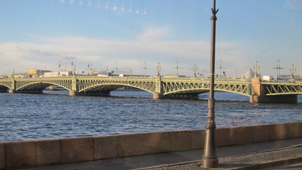 冬宮面對涅瓦河,後面即是冬宮廣場,廣場中心是為紀念1812年俄國戰勝拿破崙,於1834年豎立的高47.5公尺,重600噸的亞歷山大柱,頂尖上手持十字架的天使,雙腳踩著一條蛇,為戰勝敵人的象徵。 冬宮廣場 亞歷山大柱 六點去吃吉普賽俄式餐,餐後先送要自費到冬宮劇院看芭蕾舞天鵝湖的團員到冬宮,再回旅館,沿涅瓦河有點堵車,剛巧太陽露面,趁機在車上攝取少許䢖物街景。 三一大橋 |