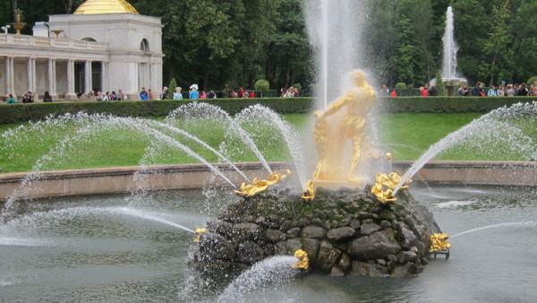 Day-03 2014/08/28 聖彼得堡-水翼船-彼得夏宮大宮殿與花園-冬宮-冬宮廣場 早餐後搭車到冬宮前的水翼船碼頭,搭乘水翼船前往彼得夏宮,可以比搭遊覧車節省30分鐘。凱薩琳夏宮以宮殿精美著稱,而彼得夏宮以噴泉花園著稱,有俄羅斯凡爾賽的美譽。 下花園,筆直的林蔭大道,修剪整齊的灌木叢,金飾的噴泉群,豪華的人工石彫。噴泉從11點才開始噴水,所以先參觀大宮殿,雖不及凱薩琳宮豪華,但終究是皇室的居所,內外有巴洛克,洛可可及古典風格,反映了不同發展階段。 曾參噴泉 下花園 參觀宮殿,大都需要存放外套及背包,而且要穿鞋套,以保護由各種顏色的木料所組成的拼花地板。夏季宮殿大多沒有設備大型吊燈,可能因為夏季日照時間長,六月七月甚至有白晝節,夜間照明不需要。 中午在夏宮附近的夏宮餐廳用餐,沙拉,湯,主菜及甜點咖啡 14:00-15:20 搭遊覽車到冬宮,現為多座建築構成的隱士廬博物館,是當今世界四大博物館之一,與倫敦大英博物館,巴黎羅浮宮及紐約大都會博物館並列。館內參觀的人潮眾多,尤其幾幅達文西的作品前更是擁擠,爭相攝影。隨著導遊的解說,重點的參觀了一個半鐘頭,據悉全館展示藏品約有300萬件,即使兩整天也看不完 。 隱士廬博物館 約旦階梯 王座 展廳