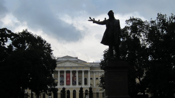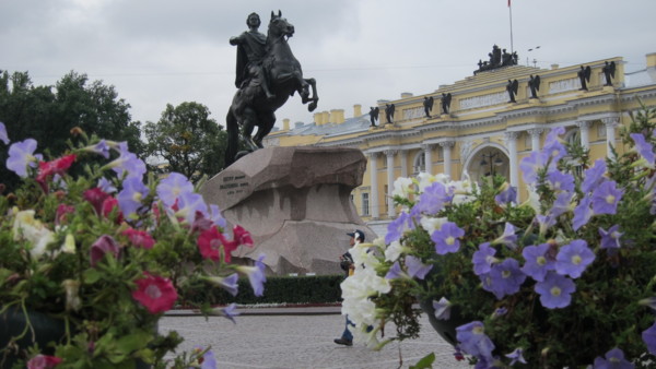 接著遊覽車停在聖以薩克教堂後方,步行到12月黨人廣場,廣場上是1782年凱薩琳大帝為了向彼得大帝致敬而鑄造,耗時12年,堪稱一大狀舉,19世紀詩人普希金還特別依據銅像寫下著名詩集-青銅騎士,因此為稱為"彼得大帝青銅騎士像"。 彼得大帝青銅騎士像 12月黨人廣場