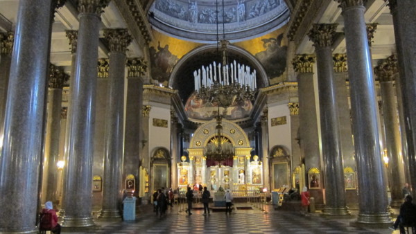 Day-04 2014/08/29 聖彼得堡-喀山教堂-船頭堡-聖以薩克大教堂-滴血教堂-莫斯科 聖彼得堡第三天的遊覽,昨天下午美麗的晴天消失了,又是多雲有雨的天氣。今天下午要搭機前往莫斯科,早晨因為要放行李上車,離開聖彼得堡的Grand Hotel Emerald,費了一些時間。 第一站到喀山教堂,以梵蒂岡的聖彼得大教堂為範本而設計。教堂內部也是和其他教堂一樣,極盡華美之能事,用芬蘭的花崗岩彫琢的列柱。教堂前小廣場立著擊退拿破崙大軍的英雄-庫圖佐夫元帥的彫像。 喀山教堂