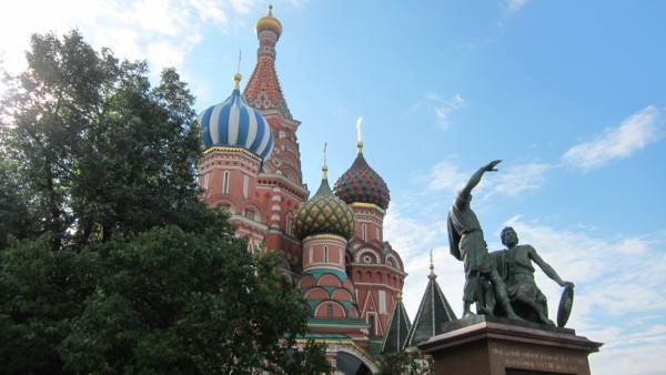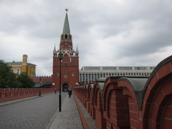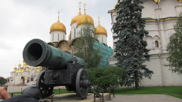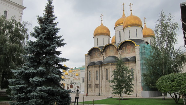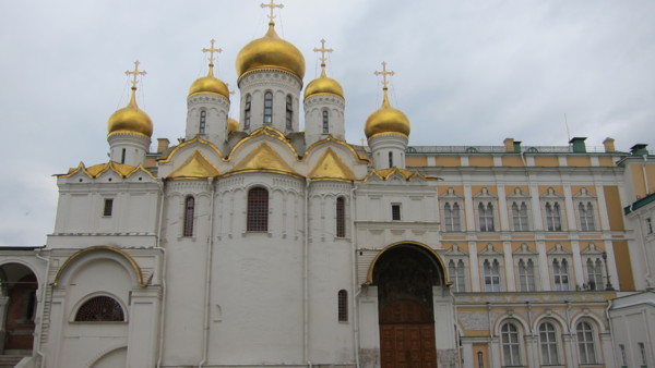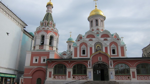 進入紅場,右邊是克里姆林的紅色城牆,左邊是喀山教堂及GUM國家百貨公司,整個紅場是呈狹長形,底部就是聖巴索教堂。紅場的意思並非顏色,雖然周圍的歷史博物館,克里姆林的圍牆都是紅色的,紅在俄羅斯文中是重要的,歡喜的,所以重要活動都在紅場舉行。目前軍樂活動的座位架子佔據了大部分的紅場,中間的列寧墓還可遠望。 喀山教堂 歷史博物館 列寧墓 紅場上舉行的活動海報 紅場底端就是聖巴索教堂,或稱聖瓦西里教堂,教堂前方的彫像是聯合貴族和平民一起反抗波蘭人入侵的一位貴族及一位平民的塑像。 聖巴索教堂前塑像 聖巴索教堂是一個由八個大小高低,風格不同的教堂圍著中央的聖母升天塔所組成,九座五彩洋蔥頂建築,使整個教堂仿佛從童話中走出來,給世人留下深刻的印象。幸好太陽露臉,照在美麗的洋蔥頂,但時時要與太陽捉迷藏。 聖巴索教堂 進入GUM要先出安檢點,就是我們昨晚進入的關口,再進入紅場須再次經過安檢。導遊帶大家進入GUM,說明集合地點,時間及廁所位置後,太家即可自由活動。GUM國家百貨公司原本就是商場貿易中心,現在則是國際品牌的"大"百貨公司,場面大,場地大,品牌大。 GUM國家百貨公司 噴泉堆滿小西瓜 中午到杜蘭朶餐廳午餐,不起眼的入口,進入中庭及餐廳,才領會俄羅斯新富豪的風格,大家座位安定後,紛紛起身四處觀賞,拍照,連廁所都不放過。麵包好吃,其他餐食普通,而且餐具上的花紋都已磨擦的看不見了,與餐廳的裝潢格調完全不搭。 杜蘭朶餐廳 下午的重頭戲,進入克里姆林。從面對亞歷山大公園的三一塔進入,同樣要經過安全檢查。因為仍是政府辦公場所,進入克里姆林後只可走在右側的人行步道,不得踏入或跨越中間車道。 三一塔入口 克里姆林就是城堡,要塞之意,所以很多城市都有克里姆林,而莫斯科的克里姆林中有個大宮殿,就是克里姆林宮。在克里姆林中我們要看的就是重40噸的鐵炮-沙皇炮,重200噸還未啓用即破裂的鐘王。 沙皇炮 鐘王