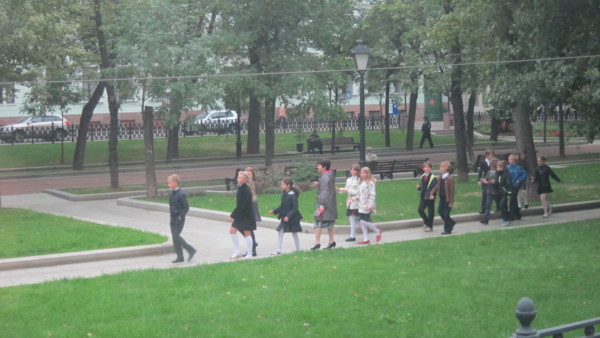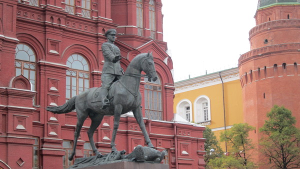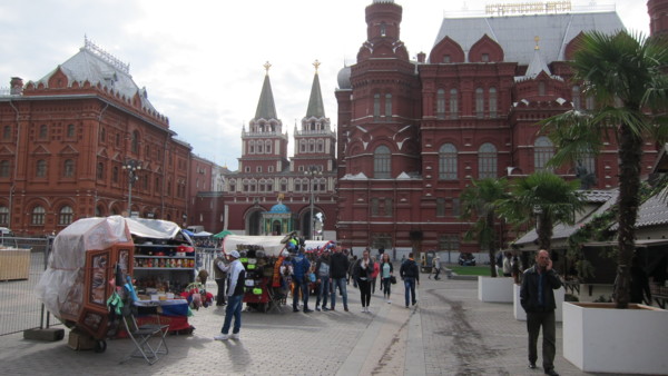Day-07 2014/09/01 莫斯科-紅場-克里姆林 今天九月一日早上多雲,今天是開學日,沿途看到列隊的小學生上學去。 列隊的小學生 首先抵達耶穌復活門前,復活門就是進入紅場的大門,首先看門的右側紅色的建築,是國家歷史博物館,館前騎馬的彫像就是二戰中蘇聯最著名的英雄朱可夫元帥。 耶穌復活門前 復活門左側,現在也是歷史博物館。進入紅場要做安全檢查,可能因為場中有活動佈置的關係,門前教堂前有"俄羅斯所有道路起點"的標誌,據說站在中心點向後投擲銅板,會心想事成真,反正聽聽就好。 俄羅斯所有道路起點