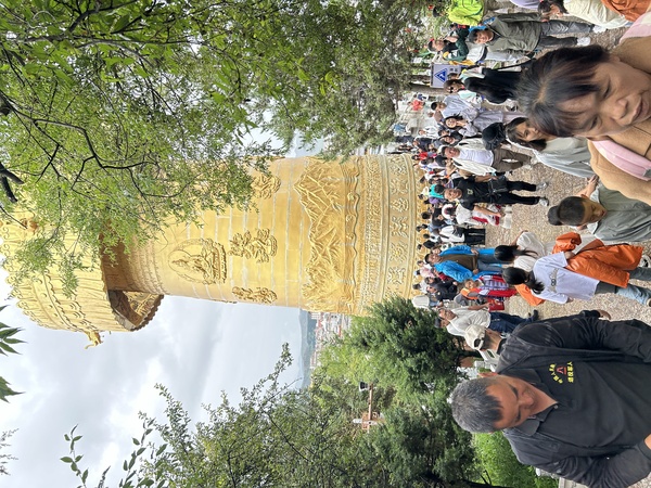 *遊客ㄧ起轉動轉經筒
