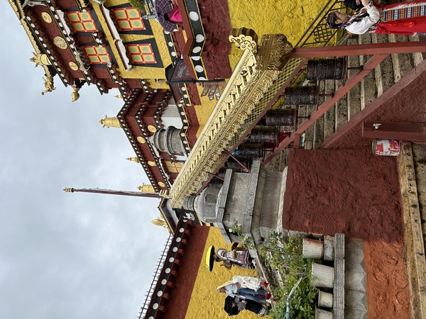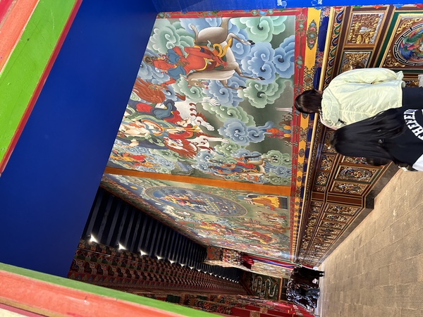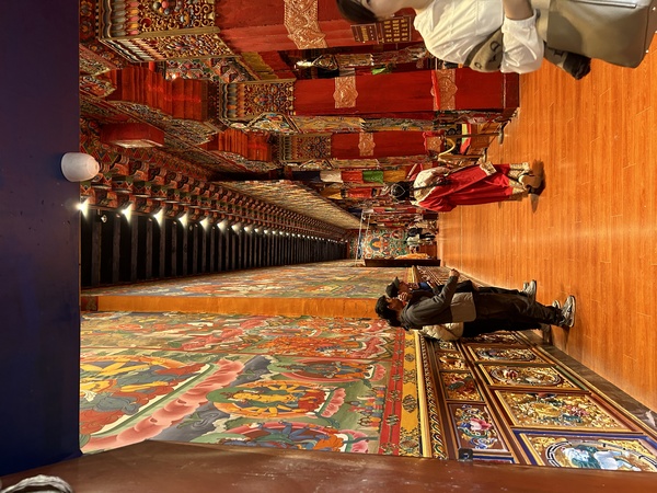 整個寺廟建在一個小山坡上,有好幾個大寺廟,我們分別的進去。不過寺廟都只能夠在外面照相,內部依照順時間方向參拜,但是都不能照相。有許多男男女女的換穿西藏的傳統服飾在各處取景照相。寺廟中的佛像各各金光閃閃,牆壁上面都有色彩非常鮮艷的圖畫,相信也是在講述佛教的故事。