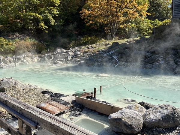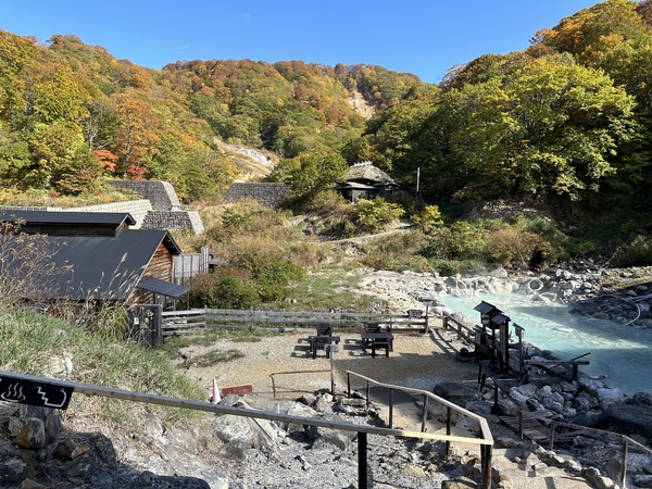 可以看到泉源的黑湯溫泉,日歸的浴場,每人¥400,再加一條毛巾¥200,被紅葉包圍的秘湯入浴,好不愜意。