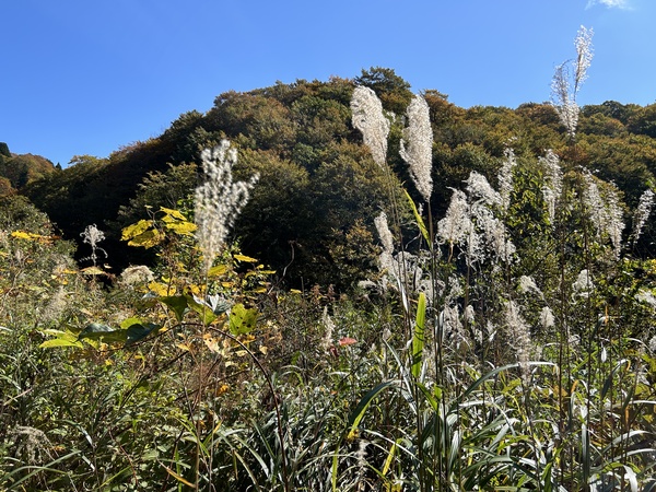 從大釜溫泉左側走新奧之細道,往孫六溫泉,剛好在修路,有點難走,但還是可以通行,沿途的紅葉與白色的芒草,完全顯現秋天的氣象。