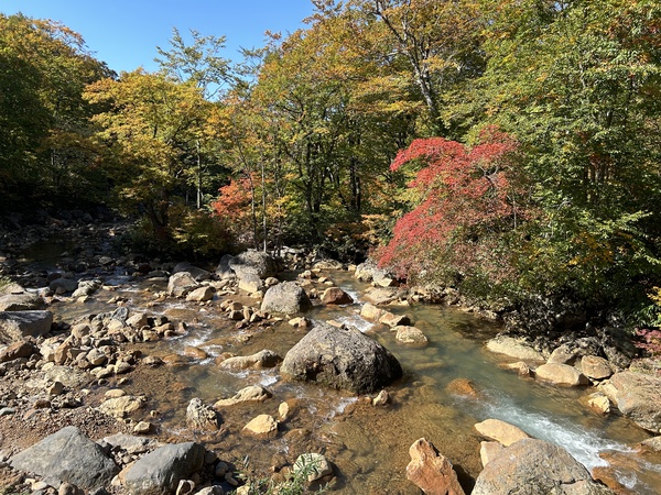 羽後交通巴士從田澤湖站出發,經過田澤湖公園,上山到終點站-蟹場溫泉。前一站就是大釜溫泉及妙乃湯溫泉。妙乃湯溫泉前的小溪附近,紅葉已經見頃。
