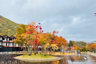 燒山旅館前的楓樹,楊遠薰攝影 燒山因為地處奧入瀨溪流的出入口,故有旅館、民宿、巴士站、郵局和一家設備相當完善的旅客休息站。 休息站內有洗手間、咖啡廳、觀光案內所和生態博物館,為在深山徜徉的遊客們提供一個避風雨的好去處。 休息站外,巨大如傘狀的日本楓林立,此時的楓葉正自上而下、由黃轉紅中,散發出令人驚艷的光采。