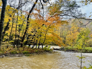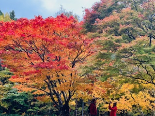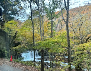 沿途滿山秋色,楊遠薰攝影 十一月初的一個清冷早晨,我與阿加自青森站搭JR公車出發,一路翻山越嶺地行約兩小時,於午時抵達奧入瀨溪流的燒山 (Yakeyama)。 沿途但見滿山秋色,金黃、澄黃的樹林交織,形成璨麗的景致,令人為之側目。 抵燒山後,我們順利找到旅館,寄放行李後,即外出尋幽訪勝。