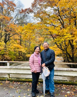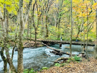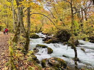作者夫婦留影於奧入瀨溪流 猶記那時,我們傍著溪畔漫行,看著豐沛的河水不斷拍打著長滿苔蘚的岩石,激起白色的浪花,周遭的環境美如仙境,覺得自己就像尋夢的愛麗絲,走在夢幻的小徑,那種感受畢生難忘! 如今有幸舊地重遊,美景依舊,老伴也還在身旁,覺得非常知足感恩。