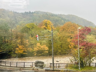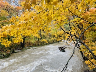 大雨之後的奧入瀨溪流,楊遠薰攝影 誠如天有不測風雲,當晚欲入夢鄉之際,忽被嘩啦啦的雨聲吵醒。原來老天下起傾盆大雨了,雨勢滂沱,猶如萬馬奔騰。 我對阿加說,看樣子,明天無法走步道了,我們到十和田乘船遊湖吧。 他回道,恐怕船也不開呢,屆時就留在旅館看雨景了。