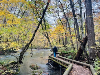 蔦川與奧入瀨溪流的交會處,楊遠薰攝影 回到燒山,我們繼續東行。沿著曲折的步道,行約十分鐘,不久就看到氣勢非凡的奧入瀨川與蔦川的會合處。 因為兩川交會,河面相當寬廣。一座很壯觀的蔦川橋橫跨寬廣的大河。站在橋上,俯瞰橋下,但見滾滾河水澎湃洶湧地奔騰,頓有「大江東去不回頭」的感受。 奧入瀨川在與蔦川交會的地方是一片廣袤的楓樹林公園,林下有曲徑,通往不知深的秘境。據說日本楓的楓葉在晝夜溫差懸殊的深秋回由黃轉紅,但這公園裡的楓依然一片金黃,底下的曲徑卻已落葉層層。 我們踏上小徑,踩著落葉,發出沙沙的足音,此時耳際忽然想起一首久已遺忘的歌: