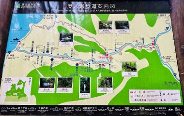 奧入瀨溪流的地圖 我們看了地圖,自忖無法走完全程,因此決定有時搭巴士前往景點,有時安步當車,欣賞兩岸風光。 值得一提的是當初規劃日本東北行時,AI即建議我們在成田機場,就購買東北鐵道周遊券。我們後來發現這張周遊券實在好用,不僅可搭東北新幹線火車,亦可搭區間火車和公車,尤其在奧入瀨溪流停留期間,JR巴士如同 Hop on - Hop off 巴士,只要向司機出示周遊券,就可一再地上下車,的確省錢又方便。