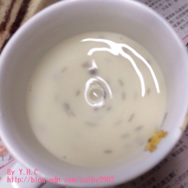 加入豆漿中 開始攪吧~~ (奇亞籽旋轉的樣子!!) 200cc 加入10克 (其實是憑感覺在加的💬) ☀️凱西小姐建議 泡了之後不要放太久 不然泡久了奇亞籽味會跑出來喔!!