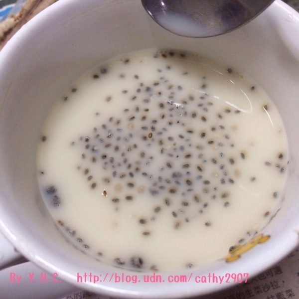 第一次泡的時候 凱西小姐是用開水 但我個人覺得奇亞籽本身會有一種淡淡的味道 (有點像油的味道) ☀️所以我通常會加入豆漿或牛奶中 喝起來就沒什麼奇亞籽味啦~ 上圖能看到奇亞籽在泡水後會膨脹 籽籽周圍會長毛 肉眼看起來還好 但喝下去時能明顯的感覺到一顆一顆的