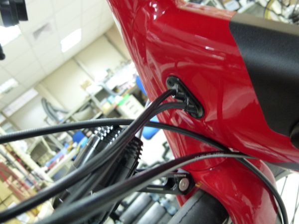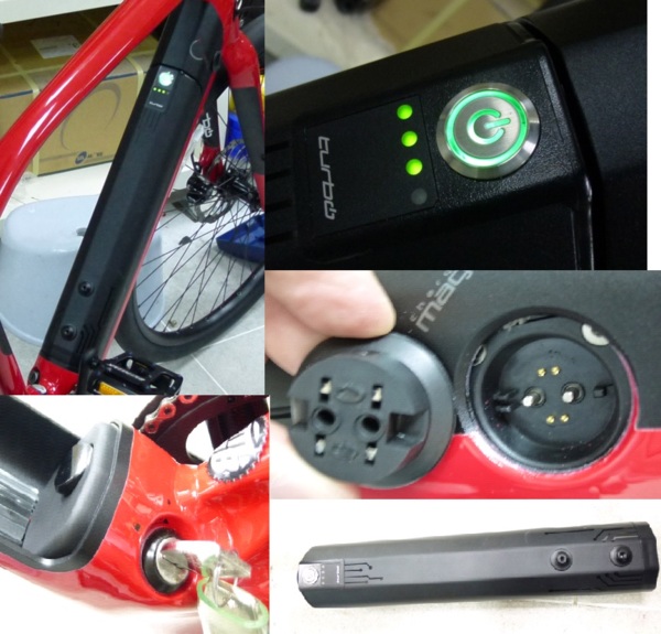 電力套件的另一個重點則是電池, 電池裝置在下管中因此下管屬於不封閉的管型, 筆者可以看到下管的壁厚比傳統的下管要厚上許多, 應該也是要避免車架強度不足的問題. 電池外殼為鋁合金, 一來可以幫助散熱, 二則幫助支撐下管的強度. 電池的開關為背光式按鈕, 旁邊有4個LED燈顯示殘餘電量, 車架與電池的充電口統一為Rosenberger磁性接頭, 電池與車架間隔有大片的橡膠材質以阻隔電池與車架間的震動/噪音. 線材則從橡膠墊與車架中的間隙來佈線, 也算是相當的明智. 此外Specilaized設計此電池時也相當聰明的留下兩個水壺螺絲孔, 故不會因加上了電池而喪失了加裝水壺的彈性. 至於最令人頭痛的電池鎖, 則以實體鑰匙的方式做在五通管的旁邊. 最重要的電池容量則為342Wh(9.5Ah), 額定500W的電控系統整體消耗較大的情況下, 若能加大一點是更好, 將會獲得較長的續航力與較大的放電電流; 但電池加大的同時, 下管管徑或長度或許必須加大, 此舉不是設計者所樂見.