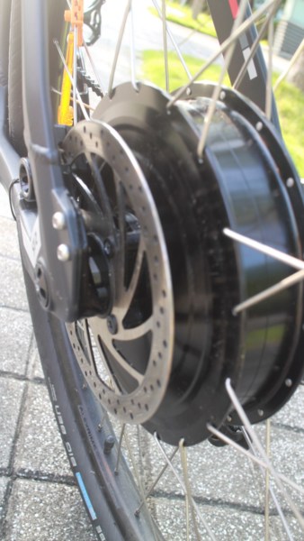電氣相關部件: 馬達為500W直驅無刷. 為配合15mm快拆故接頭也改為插拔式, 同時車架勾爪結構亦增加斜面式的anti torque arm. 重量約莫5公斤並能提供最大超過40Nm的扭力輸出.