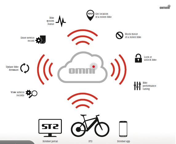 從本車的零售價格說起, 6990美元. 這個價格與Specialized Turbo的5900美元足足多出1千. 台灣人聽到會覺得吒舌與直呼不可思議, 但若與Specialized Turbo相較, Stromer ST2在整體規格上無疑地領先群雄. ST2為speed pedelec故極速可達45km/h. 稍後為大家說明高整合度的新功能. 由腳踏車部件說起: 前叉為碳纖維材質並搭配26"/2.125"的Schwalbe BigBen. 維持與ST1相同, 抓地力與吸震性維持一貫的品質. 前後輪鼓為配置15mm穿透心軸. 增加使用便利性與增加承重能力. 剎車為Magura MT2/油壓+MT4 180mm carbon steel rotor, 同時整合剎車斷電. 採用鋁合金車架, 其中下管加大以容納電池. 車輛分為兩種車款, 第一為sport; 第二為comfort. Sport有17"吋及20"的架高, 而comfort則只有17"的尺寸. 分別有黑白兩色. 塗裝上則有瑞士國旗顏色的點綴. 變速器選擇Shimano Deore XT 20sp搭配Rapid fire撥把在右手握把. 影片中的樣品車為搭配Ultegra, 故影音介紹時便直接介紹, 在此更正. 五通與大齒盤均為FSA. 配件鎖付點:水壺, 前後泥除與後貨架. 與ST1的city kit(360美元)共用. 整車重量約為28kg.