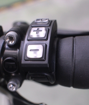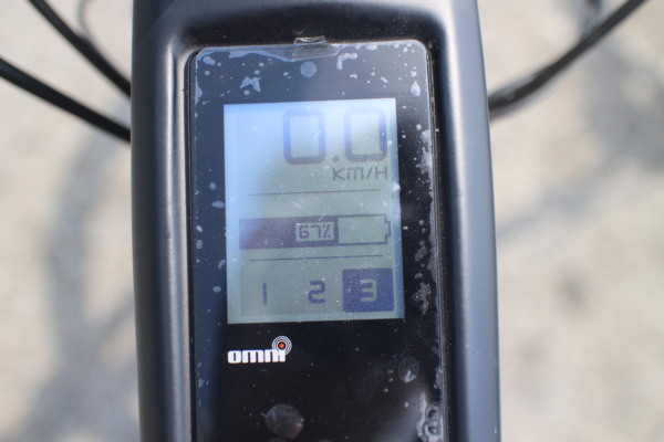 鋰鐵電池為內置於車架下管內, 以左側開門的方式取出, 配有磁性接頭. 額定電壓48V而容量為814Wh(17Ah), 也等同於ebike界的Tesla. 最大預估續航力官方宣稱150km左右. 車架上同時預留磁性接頭, 不需拿下電池便可充電. 儀表則內嵌在上管前緣, 2"左右的電阻式觸碰儀表並含背光以便應付穿戴手套時仍可以操作的需求, 開關則位於儀表的下面. 儀表顯示內容則為基本行車資訊. 若長按開關是開關機功能, 但短按為進入進階選單. 詳細操作請看影音介紹. 扭力傳感器為TMM4, 應為搭配最新一代, 因為從勾爪方向看不到出線. OMNI模組:官網上的圖式說明有包含許多功能, 但因為連結與操作APP等均需要由經銷商提供安全密碼才可行. 此樣品車無法完整測試此功能.
