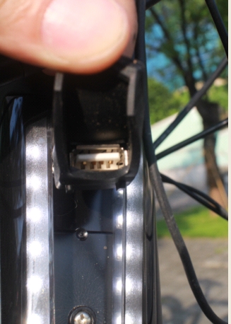 第一次在ebike中看到搭載LED日行燈的車輛, 中間有個橡膠材質的軟蓋, 用來包覆USB的接頭. 可以想像將車上的大電池當成一個大行動電源使用.