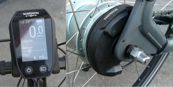 Shimano STEPS + 電變 本次展覽展出新的儀表, 前一代看起來比較鈍的外型現在看起來比較銳利一點. 另一個重點是將電子變速Di2內變系統整合進系統內. 當使用者按下變速按鈕後電子變速將協助內8速花鼓變速, 但因為中置馬達會有高鏈條張力的副作用, 因此每次變速時馬達將會自動停止運作, 待變速完成後才能恢復運轉, 試想汽車的離合器變速時也需要相同的方式, 然而只能說目前的系統頓挫感實在有點擾人, 下面也提供影片讓大家聽聽看變速的聲音與頓挫感.