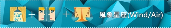 ♙風象星座(Wind/Air) Aquarius(the Water Carrier)水瓶座 inventive, clever, humanitarian, friendly 創造力,聰明,人道主義,友好 Aquarius are strong and attractive. 水瓶座是非常有能力也很有吸引力的。 Gemini(the Twins)雙子座 witty, creative, eloquent, curious Gemini are clever and intellectual. 雙子座非常聰明和有智慧。 機智,創意,口才,自信 Libra(the Scales)天秤座 diplomatic, easygoing, sociable 外交,隨和,有點大男子主義 Libra are kind, gentle and lovers of beauty, harmony and peace. 天秤座善良、溫柔、美麗,是和諧與和平的愛好者。