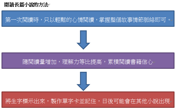 為何要讀英文小說 透過小說句子,自然而然能夠了解單字在句子中的用法。閱讀小說的同時,先試著推敲生字,並加以標示而非查字典,讀完後再作確認,製作生字卡或單字表增加記憶。翻譯書無法表現出作者的真實想法或情感,唯有讀原文書才能與作者面對面的機會。 當你真正讀完一本英文小說,絕對會帶給你極大的成就感,萬事起頭難,但隨時間累積,你會發現自己閱讀的速度越來越快,認識的單字量也會變多。 最後藉由閱讀英文小說,可與西方文學深入互動,從中理解外國文化,哪天遇到外國人也可以將此當為話題聊上兩句。 閱讀長篇小說的方法