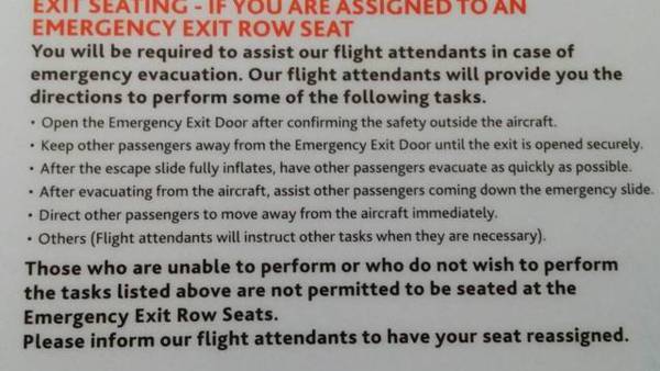 許多人出國喜歡選擇緊急逃生門出口的位置,原因為何?因為寬敞舒適!(小編手長腳特別能了解^^)但逃生口位置其實是有使用限制的,在緊急狀況產生時,需協助空服人員進行緊急撤離,因此行動不便、視力不佳、聽力受損或者是小於15歲以下的兒童,是不能安排在此位。一般,地勤人員會安排英文能力佳的人乘坐此位,因為機位旁邊的使用說明全為英文,外加需要能與空服人員溝通,因此沒有一定的英文基礎,想坐這位置很難。