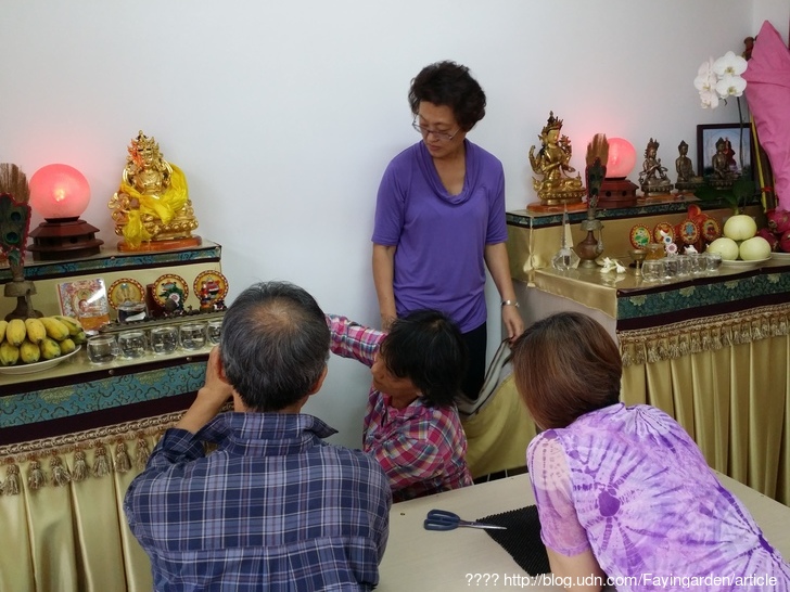 2015年11月07日美國法森寺臺北分會開光儀式紀實 2015年11月07日,家有喜事! 雖然已進入秋高氣爽的季節,但11月07日當天火熱的秋陽,似乎也在告訴我們他心中的澎湃情緒,因為法森寺大家族的慈父 ─ 上傳下鋒法師,弘法之旅終於來到了臺灣,距上次2012年養生營至今整整三年。思父念恩之情在臺灣這些弟子們的臉上表露無遺,心情更是緊張又歡喜! 上師此次蒞臺,主要的活動有二 : 一是07日為台北佛堂舉行開光儀式;二則是為08日走上修行之路系列的弘法活動作主講。 開光當天,弟子們見到三年未見的恩師,莫不滿心歡喜,更是期待恩師的法語甘露再次洗滌弟子們一身的塵埃,驅除內心無明的黑暗,讓弟子們的步伐能走得更踏實與正確。 整個開光儀式,從前行到結行,每位師兄姐在會長法嬋師姐的統攝下,莫不把握著每個淨障集資的機會,分工合作、合作分工,讓整個開光儀式的流程進行得順暢圓滿。除此,這次最難得的是加入了兩位專業攝錄影的發心菩薩,就是我們副會長洪法祥師兄的兩位公子 ─ 洪偉凱、洪偉傑兩位菩薩。不但全程參與協助攝錄影工作,在前行的作業當中更是幫忙整理佛堂與在烈日下協助曬蒲團,如此發心有為的年輕人,在現今的社會風氣已不多見,真讓人由衷的隨喜讚嘆法祥師兄全家人的發心功德與福報。