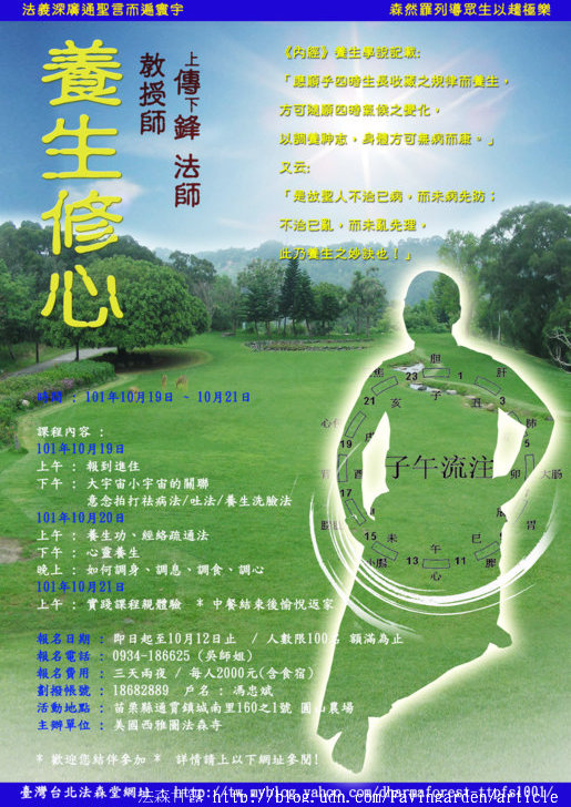 前 言 自古以來,每一個人都在追求快樂、健康、長壽,遠在秦始皇遍求不老丹,現在則是各式各樣的有機養生餐、氣功、甚至求助醫學的美容科技……等等,無非追求的就是一張青春的容顏、健康的身體!但因現代人生活忙碌及來自種種的壓力,常常作息顛倒、暴飲暴食、或者錯誤節食,最後往往傷身破財,導致身體非但沒有日益康泰反而每況愈下,於是文明病越來越多,且患者年齡層日趨下降,實令人堪憂。 師云:「養生,即保養生命之意;養生學說,乃研究保持身體康泰,以致延年益壽之理論、原則及方法之學問。」此次,上傳下鋒法師應機施教,因緣生法,自弘法以來,首次公開教授由法師自行融會《達摩易筋經》心髓、中國道家內丹養生功精髓、華夏醫典之祖《黃帝內經》中上古吐納術,並經過親身實踐創編而成的養生功法,此功法以佛教中殊勝之菩提心心境為基,讓學者體內之純陰純陽之氣自然而生,並以太極拳“中正安舒”之四字要訣恒持此氣,配以上古吐納術“輕、柔、和、緩”訣竅長養此氣。 開辦此養生活動營,實因上師大悲憫眾,希望藉此活動能讓所有參與者,能從中獲得利益,進而達到養生修心,身心康泰,增長智慧,讓人人生活得更為快樂自在,是極為殊勝與難得。機會稀有,歡迎對養生修心有興趣者,把握機會,踴躍報名參加!! 時間 : 101年10月19日 ~ 10月21日 課程內容 : 101年10月19日 (星期五) 上午 : 報到進住(當天12:00點前完成報到手續 / 午齋供應時間: 中午12:00~下午13:00) 下午 : 大宇宙小宇宙的關聯/意念拍打祛病法/吐法/養生洗臉法 101年10月20日 (星期六) 上午 : 養生功、經絡疏通法 下午 : 心靈養生 晚上 : 如何調身、調息、調食、調心 101年10月21日 (星期日) 上午 : 實踐課程親體驗 * 中餐結束後愉悅返家 * 報名日期 : 即日起至10月12日止 / 人數限100名 額滿為止 活動地點 : 苗栗縣通霄鎮城南里160之1號 圓山農場(鄰近飛牛牧場) 我們將依先後順序為您完成報名手續!阿彌陀佛…… *歡迎您結伴參加 * 法森寺臺北護法團 文宣組敬啟 2012/08/07 |