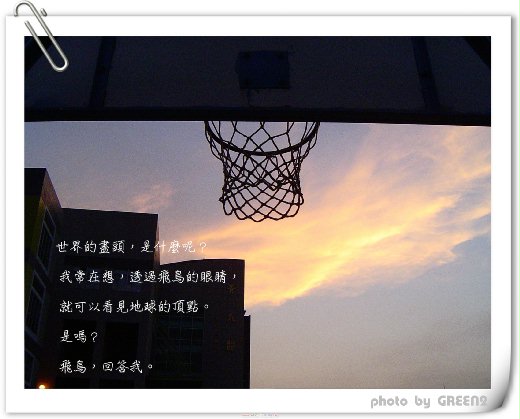 攝影:于桑 主題:夕陽‧籃球 彩虹城市 世界的盡頭,是什麼呢? 我常在想,透過飛鳥的眼睛,就可以看見地球的頂點。 是嗎?飛鳥,回答我。 第一話 紅色的月亮→夢夢篇 1992年,秋天。 「喂!枋小涵,快一點,公車來了。快啊!妳不想第一天上課就遲到了 吧?」洢漪氣急敗壞的轉頭對我大聲嚷嚷,一邊緊張的看著遠處屁股冒著黑煙的老公車悠閒朝我們這邊開過來。 「好~~~~啦!來嚕。」咬著吐司夾蛋的早餐,我和洢漪及時趕上老爺公車。 我叫枋夢涵,今年16歲,長女,就讀私立高中一年級,第一次離家出遠門讀書;柳洢漪是我最要好的閨中密友,17歲,么女,有著一雙漂亮的丹鳳眼,我們一起考上這間中部著名的私立中學,準備展開快樂的高中生活。 帥氣的椰林大道、幽靜的蓮花池,還有一個免強過得去的操場,以及一個小的可憐的網球場,這就是我的新校園。 我很喜歡這個「麻雀雖小,五臟俱全」的小學校,雖然聯考以一分之差高分落榜第一志願,但是管他的!高中生涯我來了,這就是我,樂天派女孩枋夢涵是也。 「洢,洢,妳說的就是那個輔導學長嗎?是嗎?」我指著走在我們左前方的修長背影。 「哎呀,笨小涵妳搞錯了啦,我柳洢漪的眼光會那麼差嗎?妳看,右前方那個有沒有?拿著一把黑雨傘的那個,帥吧?他才真是我夢中的白馬王子類型啦!」洢漪一臉瞇眼的陶醉起來,看來她又開始編織她的少女的春秋大夢了,看來這都要歸功於他們家是開租書店的吧?愛幻想的小腦袋瓜鐵定是少女漫畫看太多了。 「我看,不是騎白馬的王子,是坐掃把的黑豬吧!嘻!」 「枋小涵,妳,妳說什麼啊?」 「沒有啦!我說,他真是『蟀』斃了呢!」我暗自竊笑。 「這還差不多,哇!真是太幸運了,學校居然有這麼帥的學長,好棒唷!」洢漪逕自繼續沉浸在自己綺麗的幻想世界,唉!她真是中了少女漫畫的毒太深了,簡直是無藥可救。 那個「背影學長」到現在我還沒看過他的真面目,別說我不關心洢漪,只是每次都陰錯陽差的只看見那個學長的背影,依照我的目測他的身高大約是175公分,體格中等身材還算標準,嗯!及格,身為洢漪的姊妹幫她鑑定完畢,O.K啦! 其實在我單細胞似的腦袋裡根本不懂什麼叫做「鑑定」,任何男孩的身影都吸引不了我,因為我最想做的事情就是寫一部曠世奇作,然後抱著我的小綠吉他唱唱歌、寫寫詞,這才算是我心目中宇宙無敵超級完美的高中生活呀! 可是沒想到還沒寫出半個字,我的高中生活就起了大變化,源自於那一記必殺籃球。 ☆∵∴☆∴∵☆∵∴☆∴∵☆∵∴☆∴∵☆∵∴☆∴∵☆∵∴☆∴∵☆∵∴☆ 「枋夢涵,枋夢涵,妳醒醒啊?醒醒啊?」 「我……」 昏眩過去之前,只看見天空有刺眼的白花花的陽光慢慢向我包圍過來,好像電影裡天使降臨時發散出來的幸福強光,哎呀,我,是不是快要死了呢?不然怎麼會有這樣美麗的光線擁抱著我呢?這擁抱,好真實,好溫暖,感覺被天使擁抱著的感覺真好。 「小涵,妳醒了,啊!真是太好了,老師,老師!小涵醒了。」 洢漪的聲音傳入腦海,咦?我記得我正在草原上和天使玩躲貓貓的遊戲啊?睜開眼是米黃色的天花板、墨綠色的布幔,怎麼我在哪裡呢?有光,是……日光燈,還有……白色窗簾,咦?洢漪的臉、護理老師的臉、體育老師的臉,還有,一個陌生的男生的臉。 他,是,誰? 「洢,我怎麼會在這裡呢?喔,頭好疼……」 「小涵別動,妳真是把我嚇死啦,知道嗎?妳剛剛在籃球場上昏倒了,真是嚇死我,幸虧籃球社的何學長立刻將妳抱到保健室來,還通知我和老師呢!」洢漪望了望他身後的那個男生,臉紅起來。 「喔!何學長…..謝謝你,老師,對不起,讓大家擔心了。」 夢裡,有一團溫暖的光圍繞我,原來,那個溫暖的擁抱是真實的,是那個有著陽光色膚色的男生的擁抱,他的眼神如此深遂,好像在那兒見過他,是在那兒呢?想不起來,不過我知道,他的名字叫做何威,是我的救命恩人,嗯,我記住了。 在我的十指神功搔癢下,洢漪只好投降,被我拉到「日本婆婆」那兒去吃好香好濃的「雞蛋豆花」,滿足我發狂的胃。 「朋友妻不可戲」,古時候不是有這麼一句話嗎? 照我說來-----「好友夢不可滅」。 原來,洢暗戀的那個黑豬王子,就是何威。 自從他救了我一命之後,就成為第一個塞進我腦容量裡的----男生,我叫他為救命大哥。 於是,離開之前,我約了他,放學後蓮花池見。 「受人點滴,當湧泉以報」,不是嗎?更何況他救了我一命之後又請我吃冰,我枋夢涵向來不欠人恩情的,所以硬著頭皮,開口約他。 「學……學長,你來了啊?」鎮定啊!怎麼牙齒打顫呢?枋夢涵!拿出演講比賽冠軍的本領啊!把寫好的謝卡和巧感謝巧克力交給他,說聲「阿里阿多」,就可以告辭走人啦,妳,做什麼啊!緊張到腿軟。 第ㄧ次主動約男生,超不習慣的,更何況知道他是洢的夢中情人後,我更是緊張,只想趕快結束感恩大會,然後走人嚕,免得引起不必要的誤會,聽說何威學長是高中部的當紅炸子雞,許多學姊、學妹為他爭風吃醋,常常造成校園不小的騷動。我可不想回家時,被「蓋布袋」,嗚! 「枋夢涵,不,夢夢,妳這麼早來了啊?」 「夢夢?」我又想暈過去了,有種一千萬福特電流竄進身體裡的刺激,他,怎麼知道我的小名?眼前的何威的微笑,有點賊意。 「忘記我了啊?」 「城門城門雞蛋高,三十六把刀,騎白馬,帶把刀,走進城門滑一跤。」 被自己脫口而出的言詞震驚,好熟悉唷!多久以前曾經說過的話呢? 「你……你是……,你是大毛,大毛!對不對?」