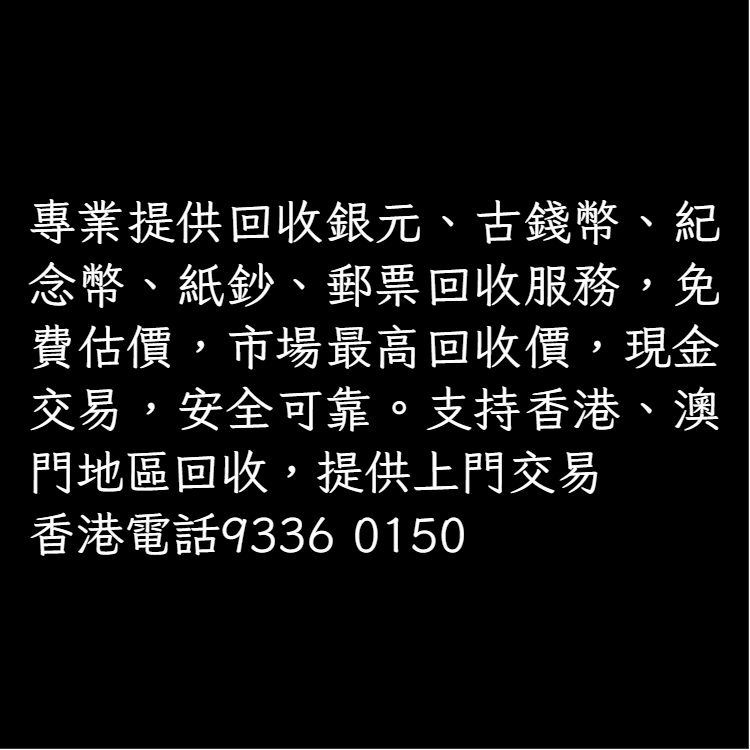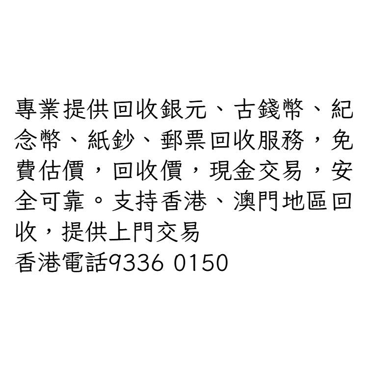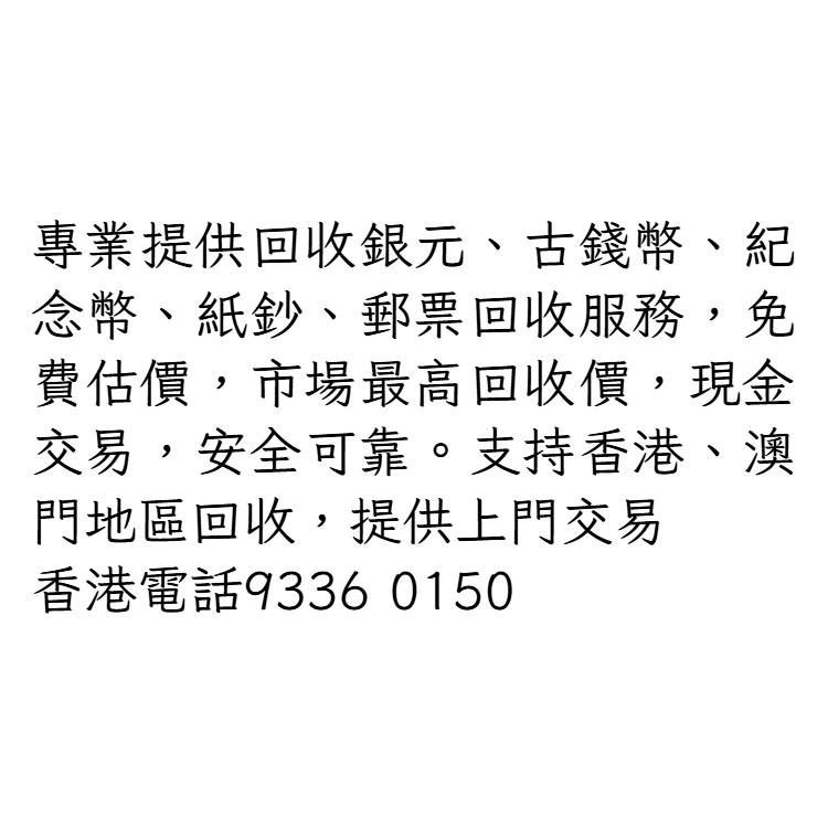 專業提供回收銀元、古錢幣、紀念幣、紙鈔、郵票回 收服務,免費估價,市場最高回收價,現金交易,安 全可靠。支持香港地區回收,提供上門交易 香港電話9336 0150