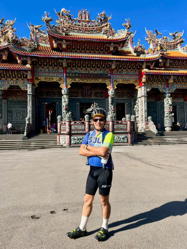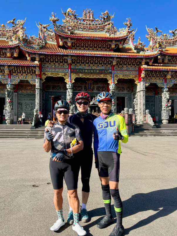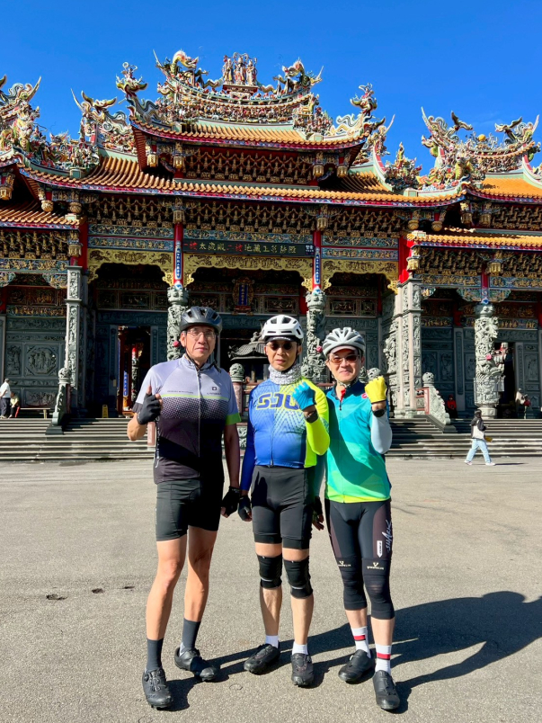 抵達林口竹林山觀音寺,大夥一起拉單車社布條拍照留影。