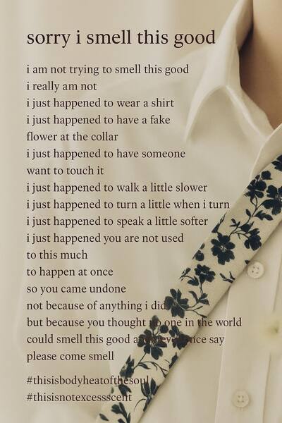 | 對不起 我這麼香 》 我不是故意香的 真的不是 我只是剛好穿了件襯衫 剛好領口有一條印花領帶 剛好有人忍不住碰一下我胸口說 好漂亮 我只是剛好走路有點慢 剛好轉身的時候有點風 剛好講話的語氣有點溫柔 剛好 你沒遇過這樣的剛好 所以有人失神了 不是因為我做了什麼 而是他以為 世界上不會有人這樣香 卻什麼都沒說過「請你來聞」 對不起 我真的沒有打算撩 或是被撩 我只是 再也不想把我自己的香味遮住了 #我香是因為我活 #不是因為誰才香 #這是靈魂的體溫 #不是表演的餘香 sorry i smell this good i am not trying to smell this good i really am not i just happened to wear a shirt i just happened to have a fake flower at the collar i just happened to have someone want to touch it i just happened to walk a little slower i just happened to turn a little when i turn i just happened to speak a little softer i just happened you are not used to this much to happen at once so somebody lose his mind not because of anything i did but because he thought no one in the world could smell this good and never once say please come smell #thisisbodyheatofthesoul #thisisnotexcessscent ![]() |