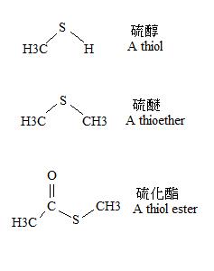 1. 「氧」和「硫」在化學符號表的同一行(電子混成軌域形狀類似),因此它們的價電子需求十分類似(價電子,一個原子用來與其他原子互相鍵結時共享的電子,是一個原子最外層的電子)。 2. 如同「氧」的電子混成軌域是從「2s」和「2p」軌域而來,「硫」的混成軌域是從「3s」和「3p」軌域而來。(2和3的差別在於能階,數字愈大,電子離原子核愈遠)這些混成軌域都會提供價電子參與原子間的鍵結。 3. 在硫醇thiol,「硫」與1個「碳」原子和1個「氫」原子鍵結(類似「醇類」的「氧」的處境)。 4. 當「硫」和2個「烴基alkyl」或「芳香基aryl」鍵結(類似「醚類ether」的「氧」的處境),這個官能基被稱為「硫化烴基alkyl sufide」。 5. 「硫化酯thiol ester」就是這樣的化合物,「SR」分子群取代了「酯類ester」的「OR」分子群。(S代表硫,R代表碳氫分子群,O代表氧) 6. 硫醇thiol有許多化學特性類似「醇類」,硫醚thioether也有很多化學特性類似「醚類」。 7. 這些官能基(含硫或含氧的分子群)的主要差異,大部分來自於硫的第三能階的價電子殼層。 8. 第三能階的軌域(硫)的體積大小,明顯大於第二能階軌域(碳),而「碳」的「第二能階軌域」與「硫」的「第三能階軌域」,在大小方面的懸殊差異,使得「碳-硫」共價鍵弱於「碳-氧」。 9. 另外,硫的陰電性electronegativity(2.5)明顯低於氧(3.5),同時,硫是更容易被極化的,因為它的價電子(最外層電子),跟氧的價電子相比,比較遠離原子核。 10. 最後,因為硫,是化學符號表的第三列,在進入到p軌域前,會先經過3d軌域,d軌域的價電子殼層可容納超過8個電子;以上這些特點使得硫通常可以跟4個這麼多的原子鍵結(比氧多)。 11. 結果,硫化合物的化性,也就變得比氧化合物的化性來得複雜。例如,磺酸sulfonic acids的形成,源自於硫有更廣闊的價電子殼層,這是氧所沒有的,雖然它們確實有相似性,磺酸(含硫)能夠形成酯和醯胺,如同羰酸(含氧)衍生的酯和醯胺。 12. 有些磺胺劑sulfonamides是威力強大的殺菌劑,例如sulfa drugs磺胺藥。(翻譯改寫自Mary Anne Fox, James K. Whitesell的《Organic Chemistry》)