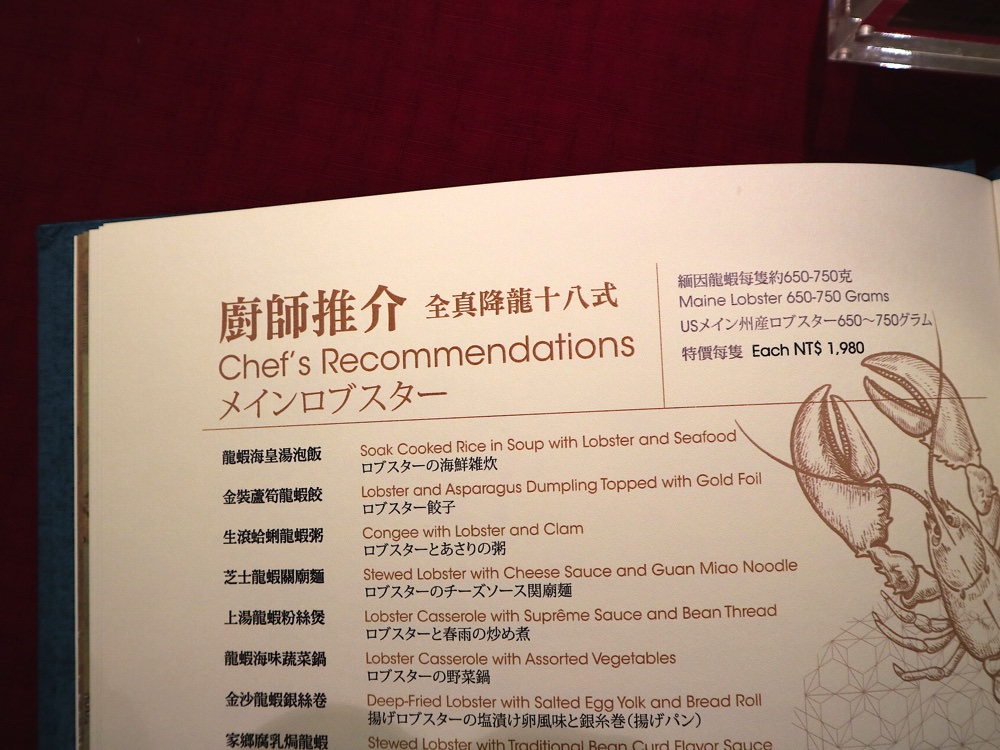 龍蝦海皇湯泡飯 $1980龍蝦的用餐方式比較特別,選用 每隻重約650-750公克的“緬因龍蝦”,均一價為$1980元,下方有十多種的料理方式,你可以擇一挑選你想品嚐的龍蝦料理!店員力推這道《龍蝦海皇湯泡飯》,我們就點了!
