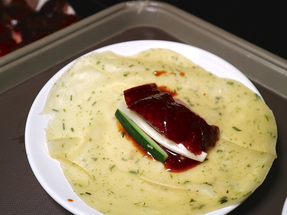 現場有專門的服務人員 把師傅片下來的鴨肉 一片片包裹捲起,裏頭還有三星蔥和黃瓜,口感清爽又豐富有層次!
