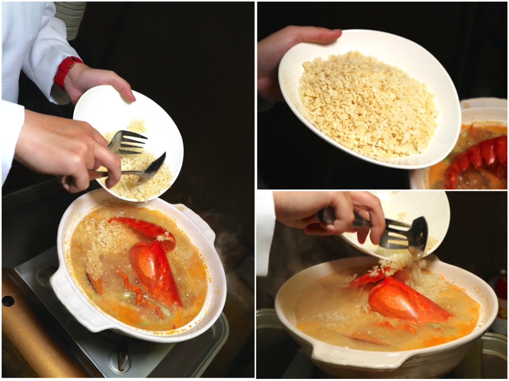看看這鍋《龍蝦海皇湯泡飯》 先烤後炸的越光米,一加入鍋湯後,便迅速吸附湯汁 濃郁的海鮮精華,更加飽滿於一顆顆的米粒中