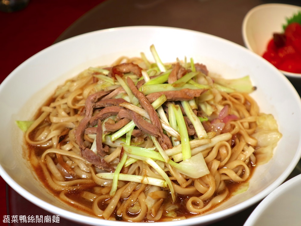 台南在地手工關廟麵,混合了濃郁醬汁,搭配三星蔥白和鴨肉絲,吃起來風味別具!