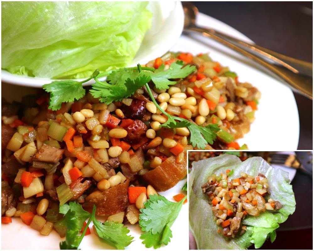 蘿美生菜片,包著鴨鬆品嚐,吃起來超清爽~ 鴨鬆內還有大量崧子和油條,口味滿特別的呢!