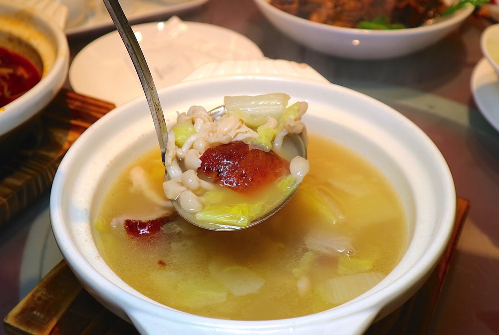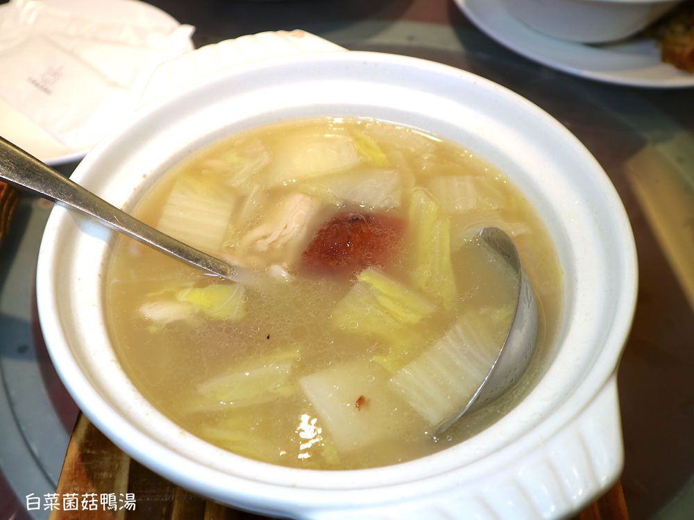 烹煮了大量白菜、菇類的鴨湯,喝起來有著蔬菜的清甜滋味, 裏頭的鴨肉保留烤鴨的脆皮,吸附了湯汁後的口感變得香潤~