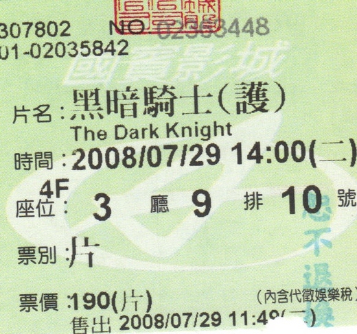 2008年7月29日中和環球影城‧美國遊學回來第二天就被帶進電影院 ‧和媽媽婆婆一起看 ‧小丑演得很棒,可惜真實的世界裡,演員希斯萊傑卻過世了 ‧有些地方看不太懂 ---------------------------黑暗騎士THE DARK KNIGHT上映日期:2008-07-17 片 長:2時30分 導 演:Christopher Nolan 演 員:【頂尖對決】克里斯汀貝爾、【斷背山】希斯萊傑、【哈力波特】蓋瑞歐德曼 發行公司:華納