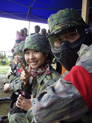 Alsace 的 Riesling 很少喝, 沒印象有喝過... (問曹老大, 他也沒印象喝過) 剛剛又翻了幾本書, 又是在 黄老師借我的名酒集裡看到..... 原來是招牌的薄荷味, 果然詭異!! 總之, 午餐就是烤肉之中, 吃吃喝喝度過! 下午還有子彈約一百多發, 也就是說至少還可以1到2場啦! 再加上, 早上藍軍奪旗成功, 紅軍領袖毛毛很不服氣, 於是帶隊教練小宗就說, 那不然就讓旗子在妳身上, 只有打到頭才能算是陣亡, 才是真正的輸掉。於是一場攻防戰又上演了!