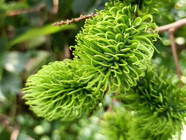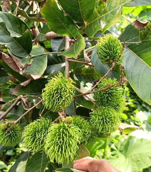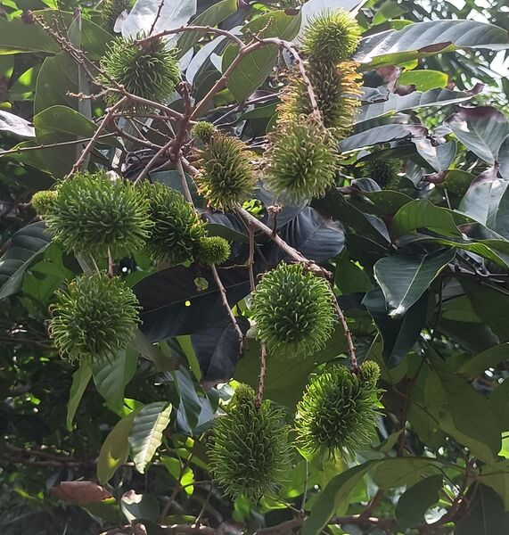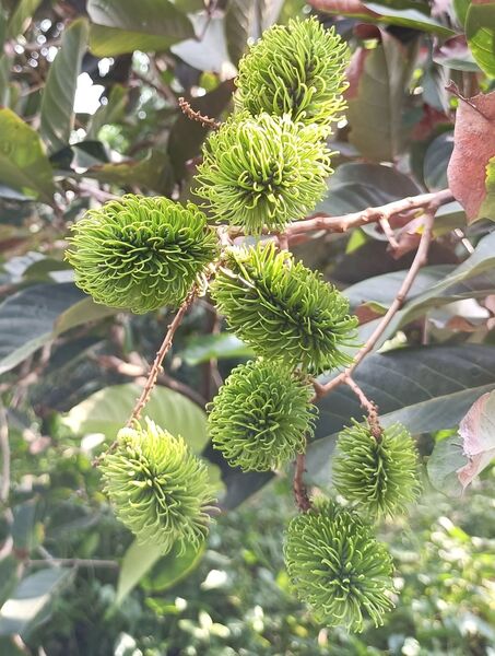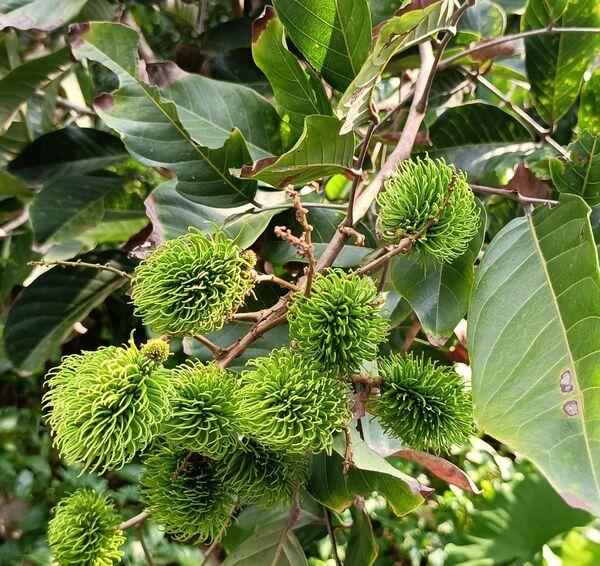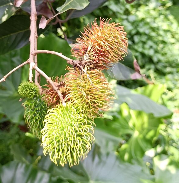 紅毛丹果實遠看像構樹果 近日回南部探親,得空到田野閒逛,發現有棵樹長了很多果實,遠遠看很像是構樹的果實,近看並不太一樣,葉形更是差異很大。以手機拍下,妻子看了之後,認為是紅毛丹。這個名字我依稀聽過,但在生活中從沒接觸過。 紅毛丹據說是30年前台灣辦桌菜的南洋味。「獨立評論@天下」胖胖樹 王瑞閔寫的“30年前台灣辦桌菜的南洋味——紅毛丹”一文提到,“1989年到1992年間我住在雲林鄉下,阿公常帶著我到處吃辦桌是這段歲月裡特殊的記憶。在那個東南亞料理尚未普及的年代,卻幾乎每一場流水席都可以吃到包著鳳梨的紅毛丹,彷彿少了這一味就顯得不夠豐盛。”、“紅毛丹果實,看起來就像凌亂的頭髮!”、“1980年代,台灣又有果農重新嘗試栽培紅毛丹。隨著資訊發達,台灣的果農不但懂得利用嫁接技術,縮短開花結果的時間,也避免了單性花無法授粉的窘境。同時還引進許多不同品種,包含了果實全為紅色的,綠色毛的,還有果肉不會黏在種子上更方便食用的離核品種,以及婆羅洲特有的黃毛丹。” 紅毛丹 無患子科韶子屬。別稱:韶子、毛龍眼、毛荔枝,紅毛果,紅毛膽 為東南亞原產之無患子科大型熱帶果樹,馬來文稱之“rambutan”,意為“毛茸茸之物”。成熟的紅毛丹果並非都是紅色的,也有黃色的果子。有的紅毛丹的核的大小近似於芝麻。紅毛丹的味道類似於荔枝。 常綠喬木,高10餘米;小枝圓柱形,有皺紋,灰褐色,僅嫩部被銹色微柔毛。 葉連柄長15-45厘米,葉軸稍粗壯,乾時有皺紋;小葉2或3對,很少1或4對,薄革質,橢圓形或倒卵形,長6-18厘米,寬4-7.5厘米,頂端鈍或微圓,有時近短尖,基部楔形,全緣,兩面無毛;側脈7-9對,乾時褐紅色,僅在背面凸起,網狀小脈略呈蜂巢狀,乾時兩面可見;小葉柄長約5毫米。 花序常多分枝,與葉近等長或更長,被銹色短絨毛;花梗短;萼革質,長約2毫米,裂片卵形,被絨毛;無花瓣;雄蕊長約3毫米。 果闊橢圓形,紅黃色,連刺長約5厘米,寬約4.5厘米,刺長約1厘米。花期夏初,果期秋初。 它喜歡高溫多濕,沒有風害,低海拔的山地環境。 (本項資料摘自中文百科https://www.newton.com.tw/)