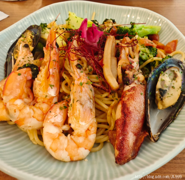 坐定後我火速掃碼開啟手機點餐,他便翻開紙本MENU確認再三以防出錯。果然是好哥兒們,40年不見,依舊保有合作無間的默契! _ ↑套餐附湯我選【培根奶油蘑菇湯】&同學選【夏綠沁經典南瓜濃湯】火侯都剛好,食材有完全的融入濃湯裡,呈現極香醇的好喝。100分 ↑主餐【剝皮椒香海鮮圓直麵】*2 ($698) 食材新鮮,簡單調配義式迷迭香料,鹹度味道很到位,剛好不過火,吃得到滿滿的鮮嫩白蝦、小捲、淡菜所釋放出的海味,融和入整體的蔬菜及麵條而轉換甜味。好吃!